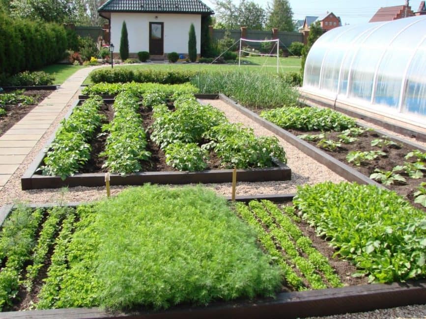 - традиционный огород со множеством грядок со съедобными культурами, травой;