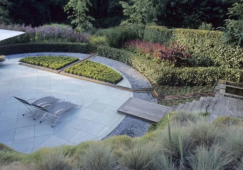 Часто вместо газонов создают просторные мощёные площадки со сложным узором из цветной плитки или камня. В оформлении бассейна, беседок, других сооружений применяют мрамор, мозаику.