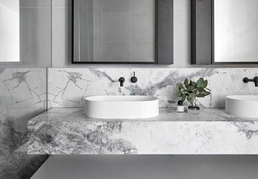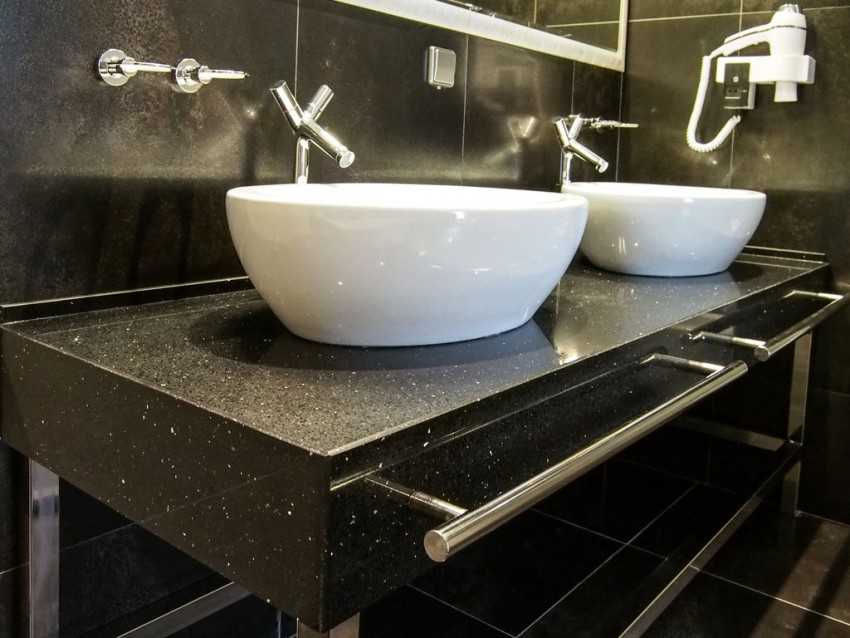 Слово «столешница» вызывает ассоциации с кухней в первую очередь. Однако благодаря своей влагостойкости и устойчивости к перепаду температур, акриловые изделия стали использовать в ванной комнате. Главное требование для столешниц в ванную комнату — прочность, устойчивость к повреждениям и влагоустойчивость.