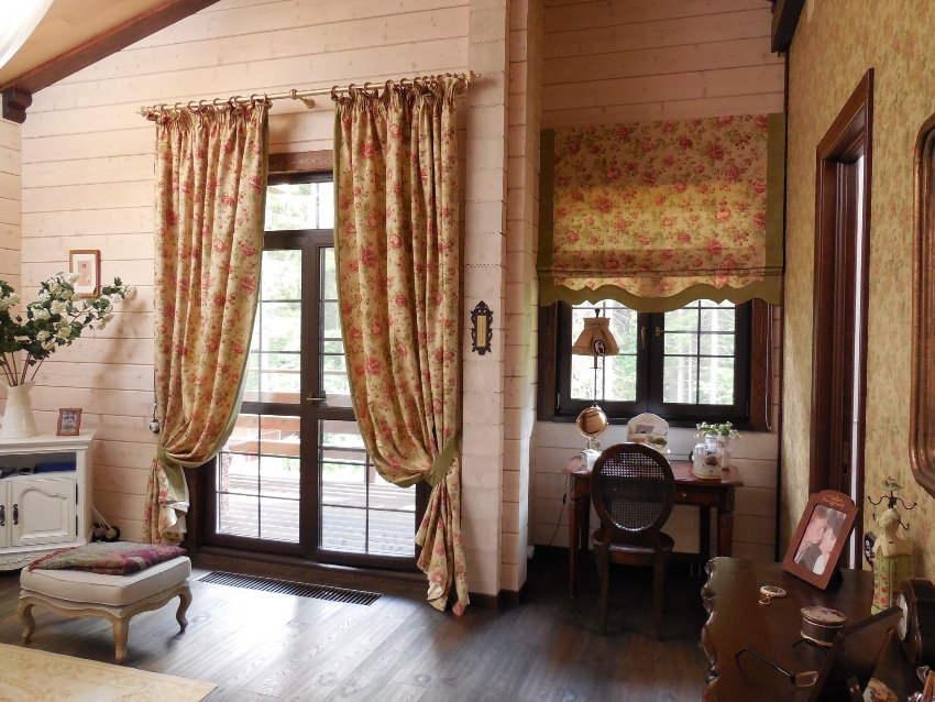 В деревянных жилищах очень часто и довольно эффектно используется стиль прованс. Мягкие и пастельные тона ткани (белый, голубой, розовый и кремовый) делают окно светлым и нежным, визуально увеличивая его. Приветствуется природный принт, широкие обтачки, оборки и натуральные кружева.
