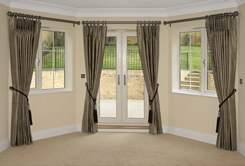 Традиционный представитель – текстильный тип. Этот вариант используют часто в качестве штор на окно с дверью. В отличие от тех вариантов, когда материал использовался для оформления окон, в этом случае ширина изделия меньше, отсутствует тюль. Можно оставить их прямыми. При желании, используют в качестве дополнительного украшения ламбрекены.
