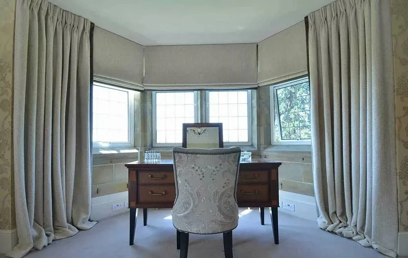 Светлые шторы на эркерных окнах в кабинете создают рабочую атмосферу и не отвлекают внимание от дел
