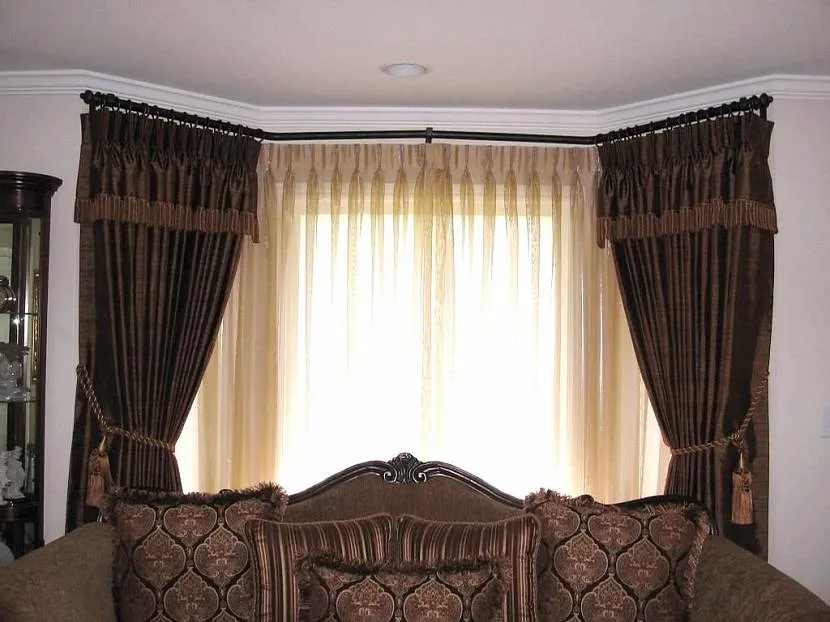 Коричневые занавески для эркерного окна в классическом стилеИсточник fabrikatkani.com