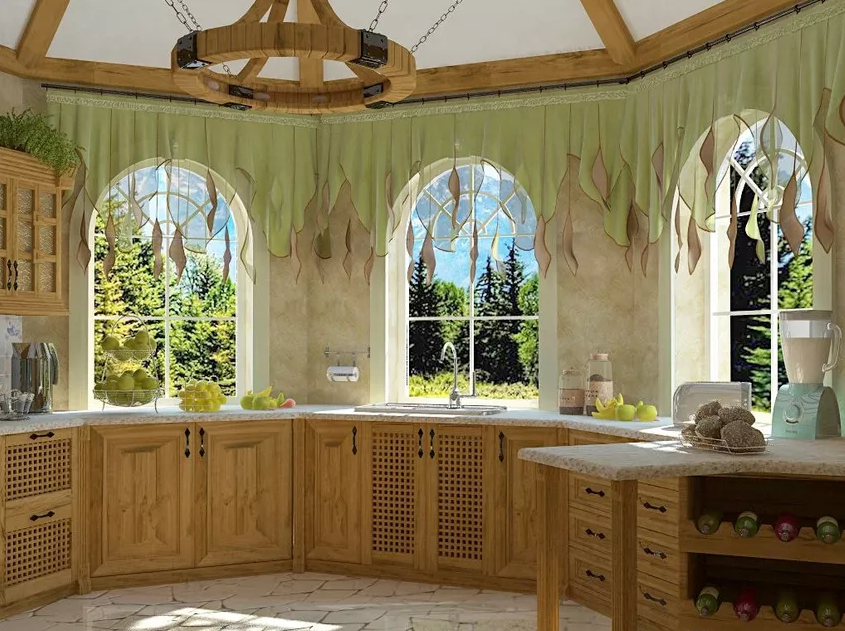 Уместны на кухне и более сложные модели штор на эркер (со складками, объемными сборками, многослойные) – при условии, что их длина, плотность, модель гармонируют с общей его стилистикой: иногда лучше взять для таких окон тюль, иногда тяжелую ткань с пропиткой от влаги. Кроме того, слишком объемные, замысловатые конструкции в небольшом помещении выглядят тяжелыми и неуместными.