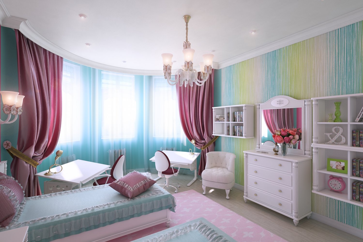 Для детской или подростковой комнаты шторы на эркер подбираются в зависимости от пола и возраста ее обитателя, а также его потребностей. Романтичной принцессе больше подойдут рюшки и бантики, сдержанному спортсмену – лаконичные модели. В оконной зоне таких комнат уместны диванчики или мягкие сиденья с текстилем в тон.