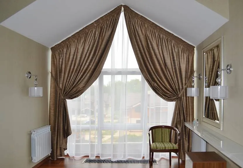 Таким образом можно прикрыть форму треугольного окна, используя двойные шторы с отворотом, и слегка зашторив их