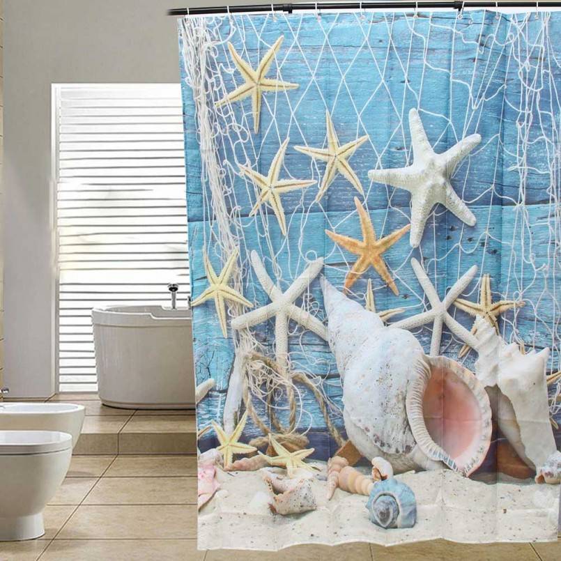 Перейдем к самой очевидной и распространенной по морской отделки комнате — к ванной. Благодаря распространенности рынок изобилует ванными шторами с якорями, ракушками, камнями, пляжами и рыбами. Тут нам повезло, ведь тогда нам предоставляется широкий выбор из тысяч предложенных вариантов.