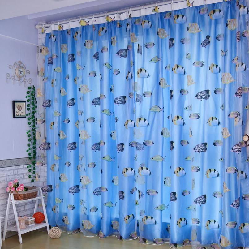 Морской рисунок. Самый простой вариант – соединить белые гардины с портьерами синих оттенков. Для придания большей схожести с морем берите ткань с тематическими изображениями. Лучше остальных для детской комнаты подходят принты рыб, якорей, дельфинов, крабов, морских звёзд, накатывающих друг на друга волн и кораблей. Для мальчиков можно создавать портьеры с изображением пиратов, попугаев, мечей, ружей, мушкетов и другого.