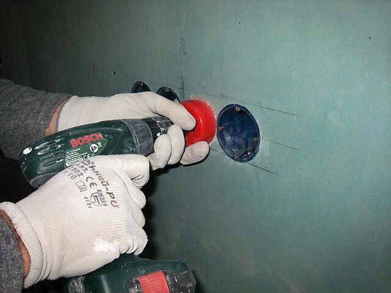 После штробления и очистки канавок переходят к бурению отверстий под подрозетники. Для этого используют специальные круглые коронки с твердосплавными пластинами.Размер коронки выбирается в зависимости от размеров подрозетников, которые планируется устанавливать. Как правило, это размеры 65 и 80 мм.