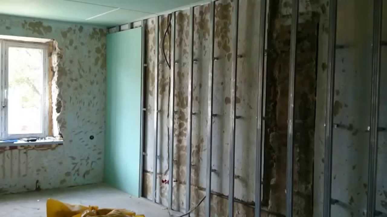 - Между черновой стеной и листом ГК можно уложить слой утеплителя, который улучшает теплотехнические характеристики конструкции.