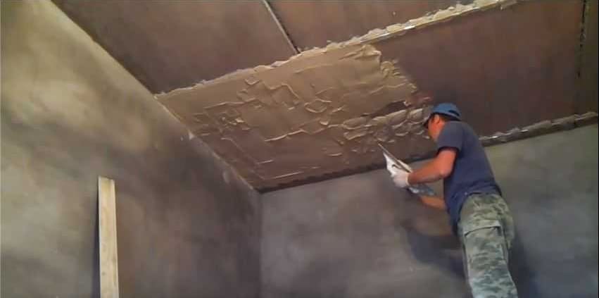 - раствор при помощи шпателя набрасывают на отдельные участки потолочной поверхности и предварительно разравнивают;
