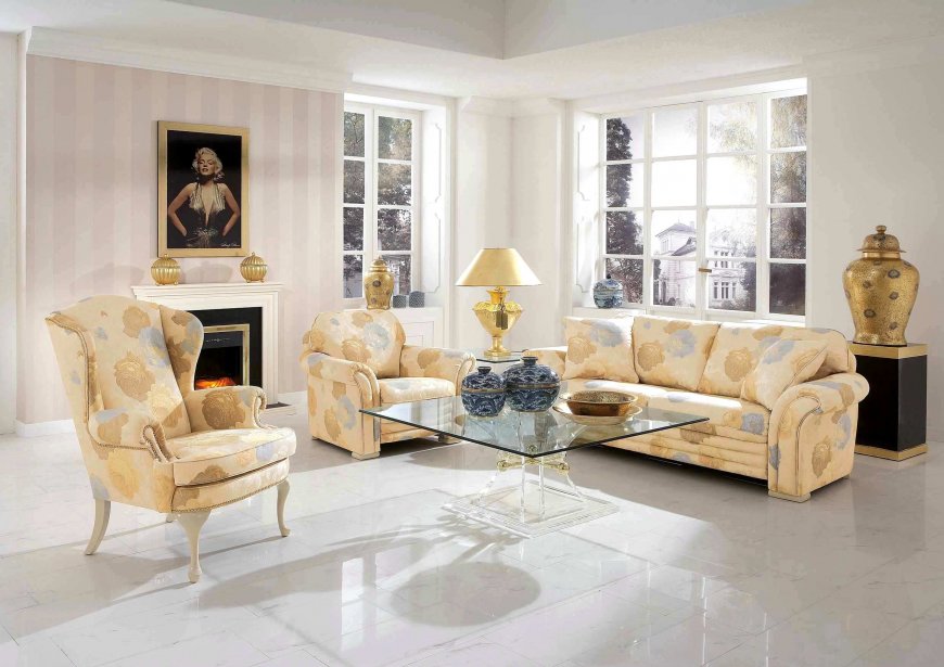 - Классицизм — строгость и гармония, солидность и изящество. Стиль сохраняет свою привлекательность благодаря гармоничному сочетанию спокойствия и роскоши. Ему свойственны богатые декорации — лепнина, драпировки из дорогой ткани, но в меру (они не перегружают интерьер гостиной). Кресла могут быть украшены резными панелями, рельефными медальонами, гнутыми ножками, но при этом иметь прямые четкие линии, быть простыми и функциональными. Обивка — из ткани однотонной или с цветочным орнаментом. Цветовая гамма сдержанная.