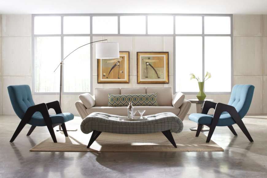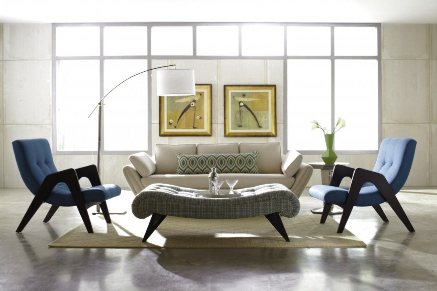- Модерн — стиль, зародившийся на заре прошлого века и сохраняющий актуальность, предполагает плавные линии в интерьере, зонирование, приоритет пастельных тонов и отсутствие лишнего декора. Современный модерн — один из экономных вариантов интерьера, поскольку не требует использования натуральных материалов. Кресла для гостиной в этом стиле выглядят компактно, неброско. Они эргономичны, но недостаточно комфортны.