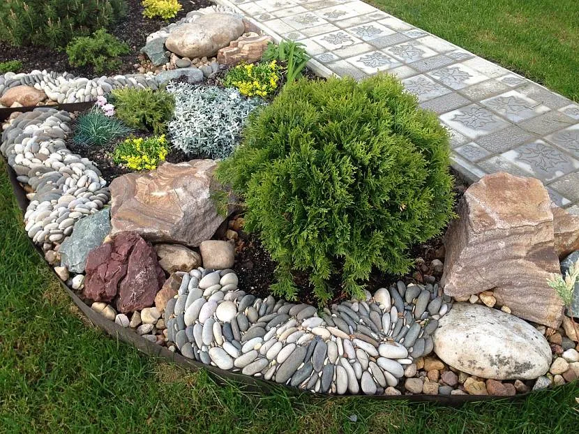 - Возле мелких по размеру камней уместно выглядят почвопокровные растения или небольшие лиственные виды. Рядом с валунами можно высаживать более крупные варианты насаждений — кустарники, хвойники, карликовые деревья.