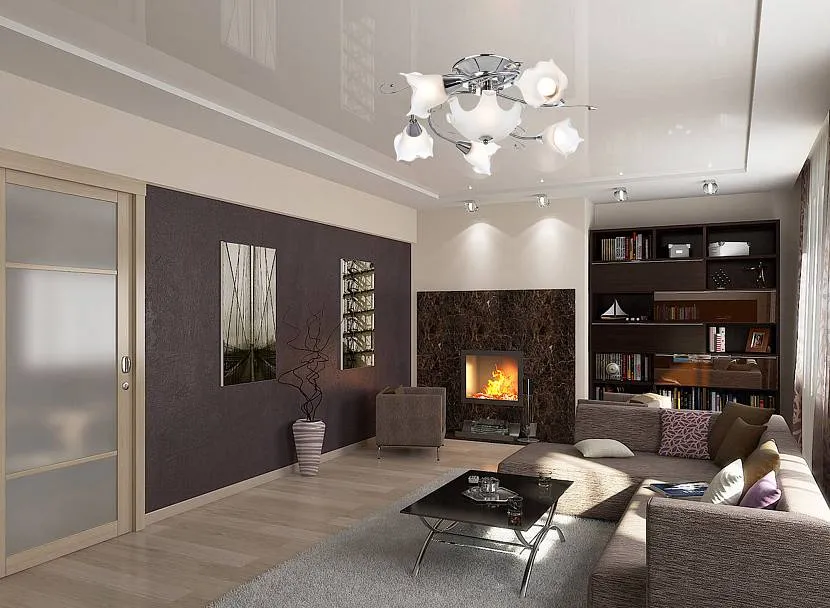 На фото люстра на двухуровневом натяжном потолке в интерьере гостиной.