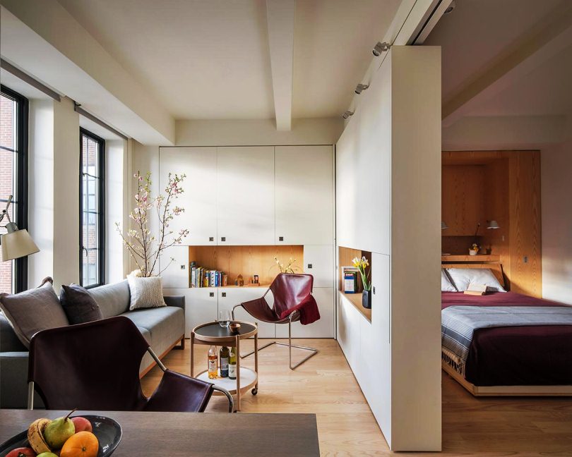 Обратите внимание на интересное функциональное решение с кроватью, которая прячется в нише, освобождая много места