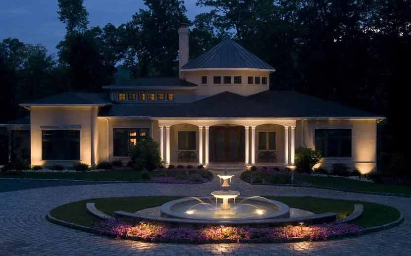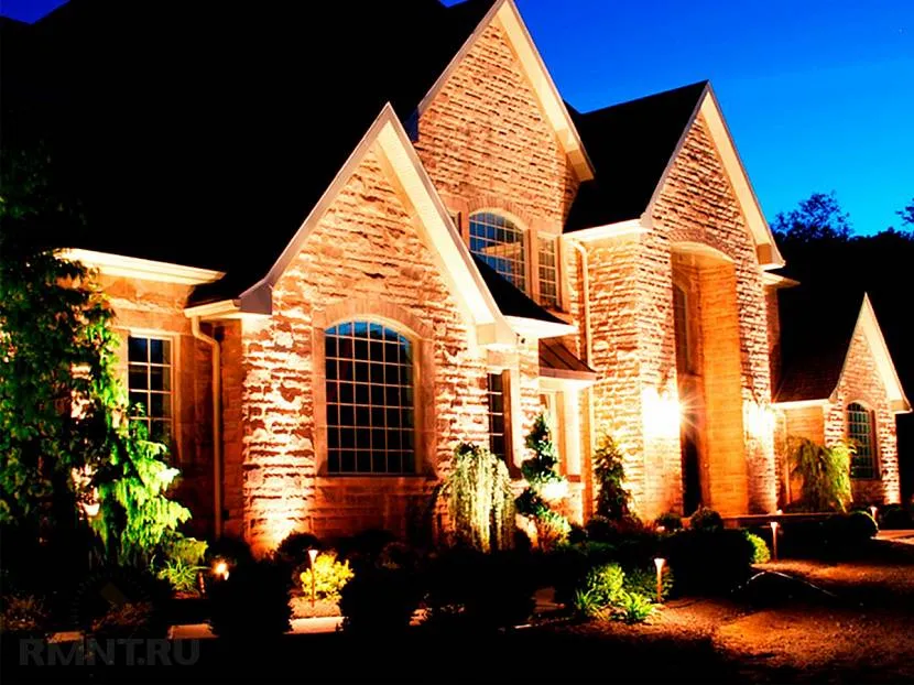 Только подсветка фасада дома будет смотреться слишком ярко и вульгарно. По приусадебному участку дизайнеры рекомендуют разместить несколько «веток», менее ярких, чем освещение основного строения на территории.