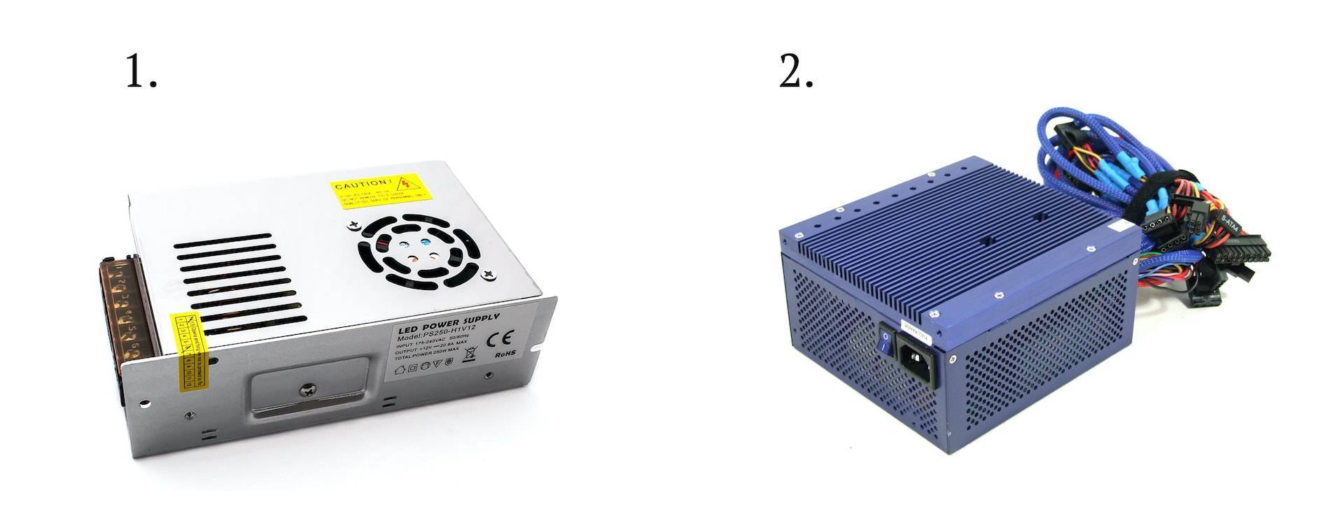 Для адаптации напряжения рулонного светового прибора, которое составляет 12 или 24 В, к напряжению сети 220 В, приобретают понижающий трансформатор (блок питания). Блоки питания производят разной мощности. Прежде чем приобретать его, рассчитывают мощность, которая понадобится для подсветки рабочей зоны на кухне, следуя алгоритму.