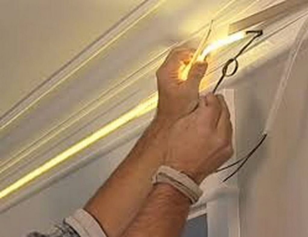 Важно! Главная проблема в обустройстве световых линий заключается в том, что сам светильник по многим причинам не может быть закреплен на пленочном полотне потолка. Во-первых, вес даже самого легкого источника света приводит к провисанию поверхности, а кроме того, технологически нельзя делать большое количество отверстий на полихлорвиниловом полотне в одном ряду, это приведет к разрыву виниловой пленки