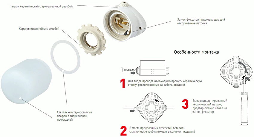 Схема монтажа термостойкого стеклянного светильника с керамическим патроном для сауны