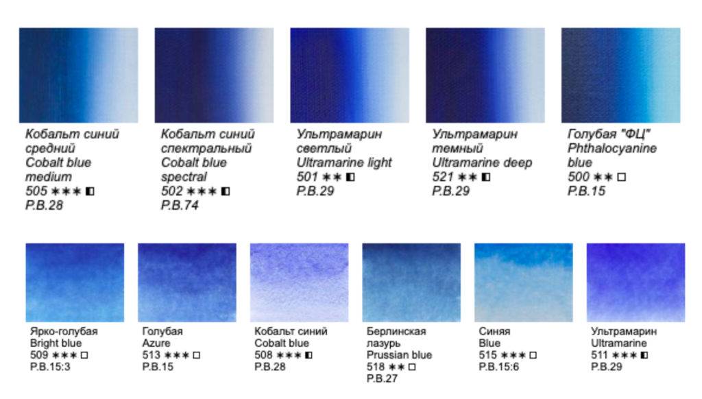 К основным оттенкам синего, встречаемых в палитрах масляных красок относятся: кобальт синий, ультрамарин, голубая ФЦ. В гуаше исходный синий представляют оттенки: лазурь, ультрамарин, синяя спектральная. В палитре акварели — это берлинская лазурь, синяя, ультрамарин.