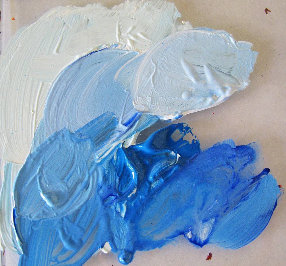 Делать оттенки синевы с зелеными отсветами просто. Эффект темно-зеленого тона дает введение в синь небольшого количества готовой зеленой краски. Если ее нет, можно поступить иным образом. Поскольку соединение синего и желтого дает зеленый колер, можно добавить к сини немного желтизны. Далее краску высветляют белилами, в результате получается оттенок третьего порядка, менее насыщенный.