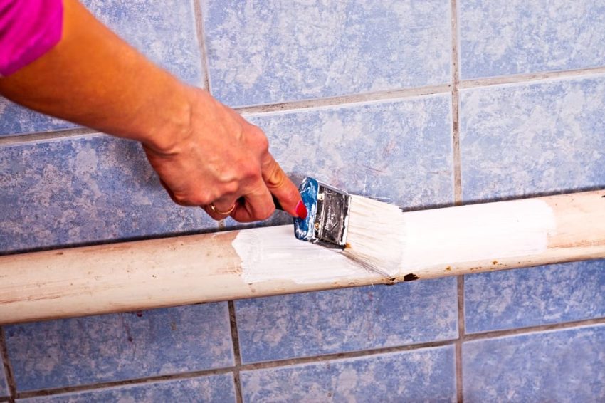 Удалить ржавчину, покрыть трубы белой масляной краской. Нельзя наносить материал в отопительный сезон (если трубы выполняют функцию обогрева). Работать удобнее маленьким валиком.