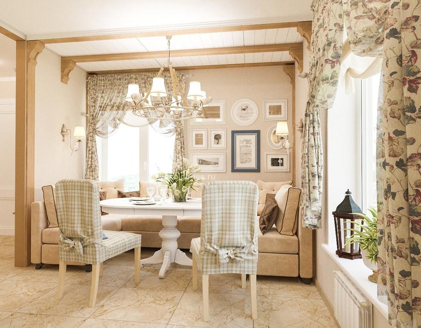 Главное в оформлении такой зоны – присутствие элементов из натуральных материалов, обилие света, преимущество оттенков из пастельной цветовой гаммы. Весь текстиль должен быть легким, воздушным, иметь ненавязчивые тона и выступать отдельными деталями декора.