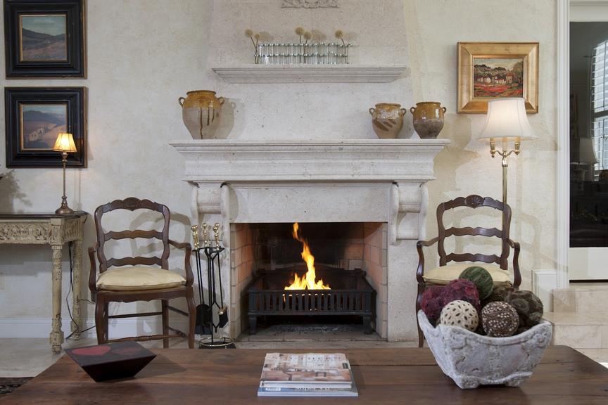 При наличии камина его облицовывают камнем, а сверху размещают элементы декора в виде кованых подсвечников, фарфоровых статуэток, фотографий в состаренных рамах.