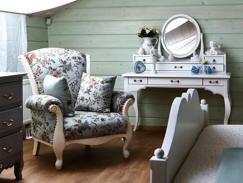На мебели видны характерные потертости. Деревянные предметы обстановки подвергают искусственному состариванию. Обивку обычно используют тканевую с мелким цветастым узором.