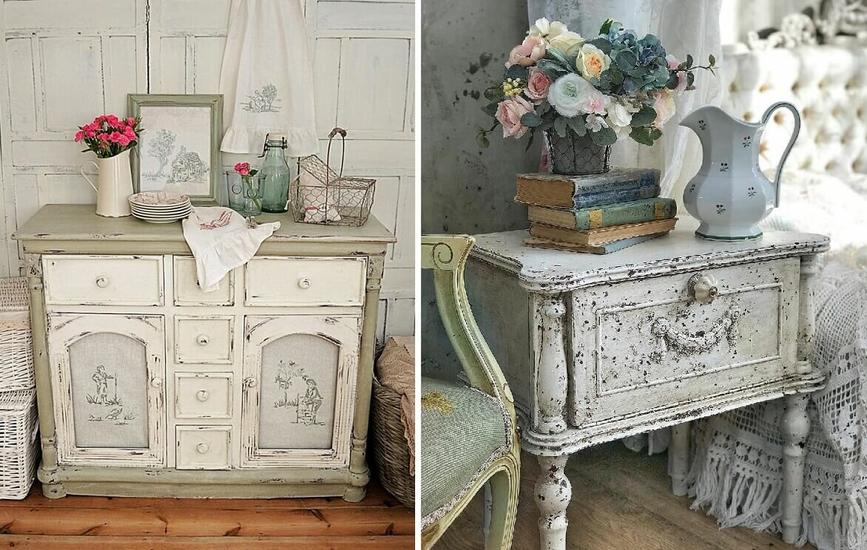 Французы отдают предпочтение низкой мебели белого, нежно-голубого или светло-фиолетовых оттенков с интересной фактурой. Это могут быть потёртости, трещинки — всё, что говорит о её длительном использовании. При всей кажущейся простоте, она выглядит добротно и элегантно благодаря изогнутым ножкам и лаконичным формам.