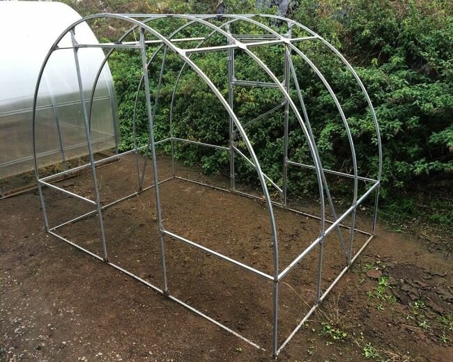 Если размеры теплицы не превышают 6×2×2 м достаточно трубы с ребром 25 мм и стенкой 2 мм. При больших габаритах выбирается профиль 40×20×2 или 40×40×2 мм. Для горизонтальных стяжек подойдёт труба 20×20×1-1,5 мм.
