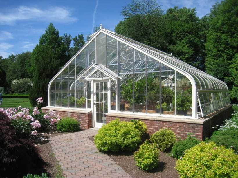 Этот вид теплицы относится к дорогим и сложным в изготовлении конструкциям. Используется стекло, которое долговечнее плёнки, поликарбоната и агроволокна. Так как строение имеет большой вес, то потребуется залить фундамент и сварить устойчивую основу.