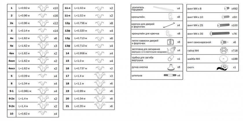 - Для возведения теплицы необходимы комплектующие изделия, такие как торцевые профили, соединительные планки, саморезы, шайбы и перфорированная лента.