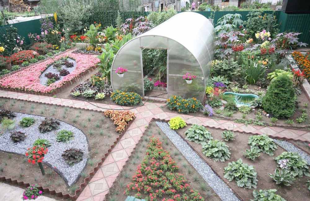 Красиво смотрится сочетание крупных насаждений с декоративной листвой и невысоких ярких многолетников. С теневой стороны теплицы будут отлично чувствовать себя представители хвойных растений. Оформление пространства около парника декоративными элементами, гравием и цветной галькой подчеркнет изысканную прелесть цветочных насаждений.