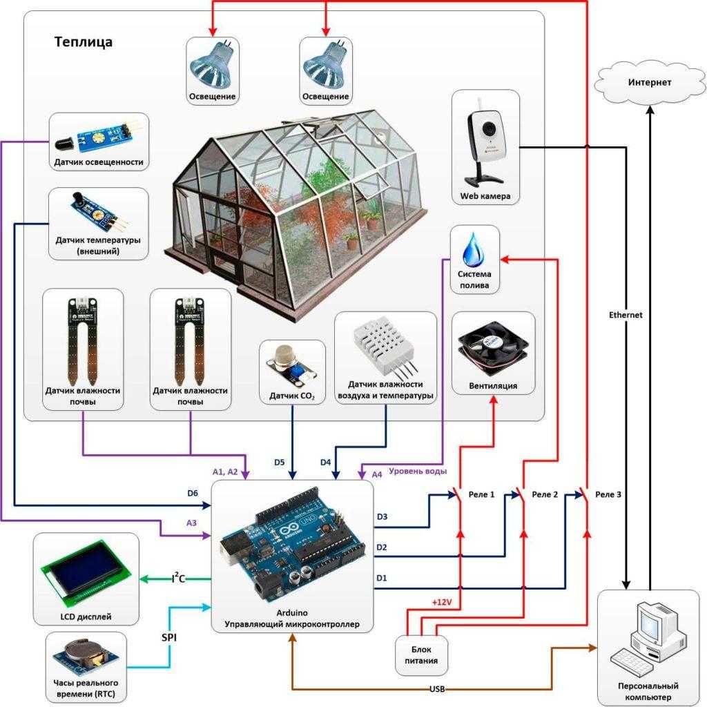 - контроля уровня CO₂. Соответствующий датчик связан с вентиляторами, посредством которых помещение освобождается от выработанного растениями кислорода. Подкормка растений двуокисью углерода повышает урожайность на 30%;