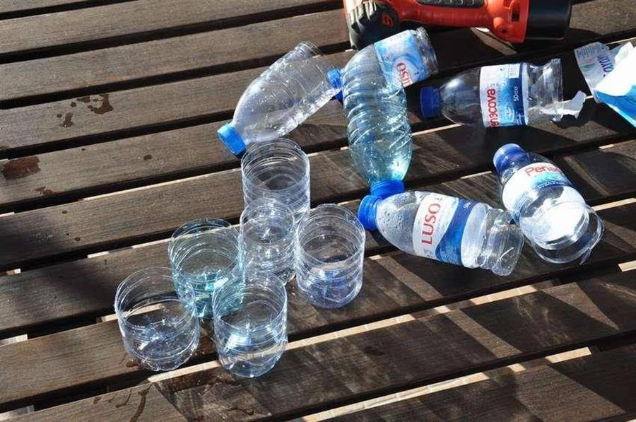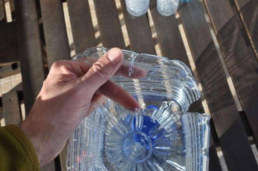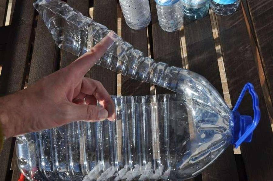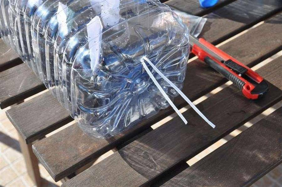 Одна из стенок большой пластиковой бутылки отрезается с трех сторон: