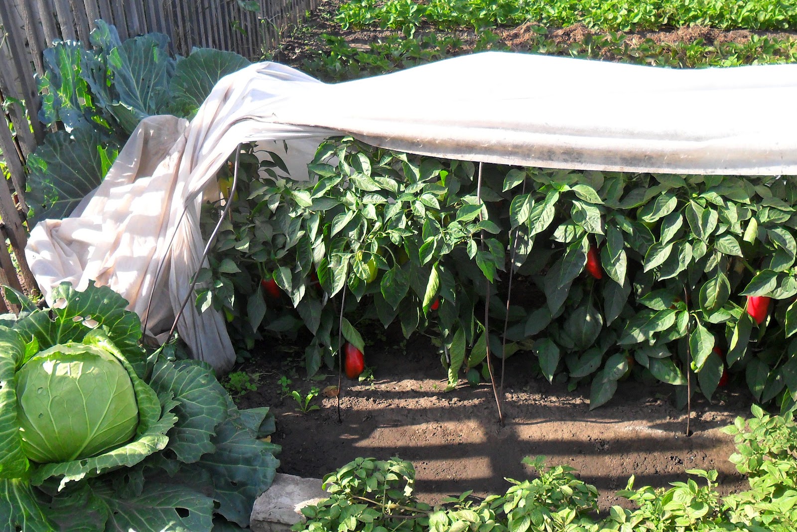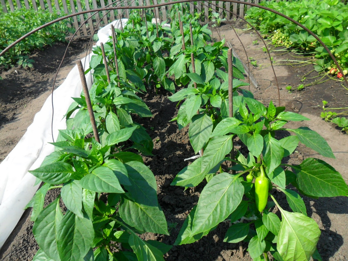 Как и со всеми вышеперечисленными культурами, теплая грядка сначала поливается горячей водой, отстаивается 3 дня, а после можно осуществлять пересадку. Готовые ростки прикапываются землей, поливаются и прикрываются пленкой. Защитный материал растягивается по колышкам или дугам, установленным на грядке. С приходом постоянного тепла пленка убирается. Таким образом, перец будет находиться в искусственном парнике и защищен от солнечных ожогов.