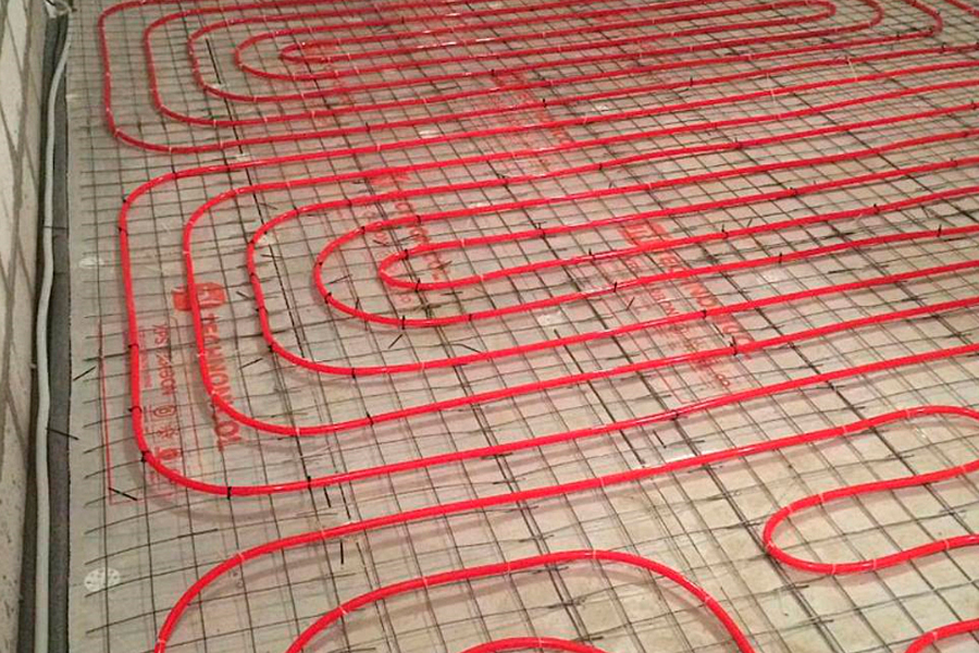 Второй этап — укладка трубопровода. На слой теплоизоляции стелят полотно стеклосетки и начинают укладывать петли теплого пола, используя заранее разработанную схему. Трубку крепят к сетке капроновыми хомутами.
