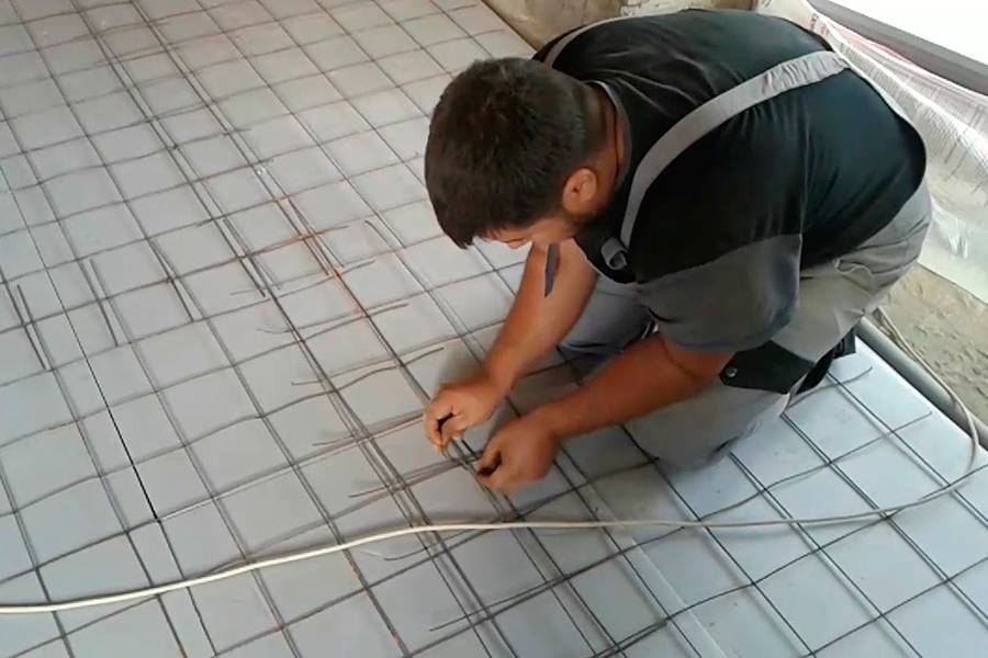 Электрический кабель для теплого пола поставляется в бухтах, так называемыми нагревательными секциями. Его укладывают на утепленное основание пола зигзагами и крепят к монтажной или армирующей сетке, с таким расчетом чтобы максимально равномерно распределить тепло, а сверху устраивают цементно-песчаную стяжку. Преимуществом этого вида электрического пола является то, что увеличивая или уменьшая расстояние между витками можно изменять мощность нагрева. Кроме этого сам нагревательный кабель обойдется дешевле, чем нагревательные маты или пленочные элементы. Недостатками можно считать более сложный и трудоемкий монтаж и необходимость относительно толстого слоя стяжки.