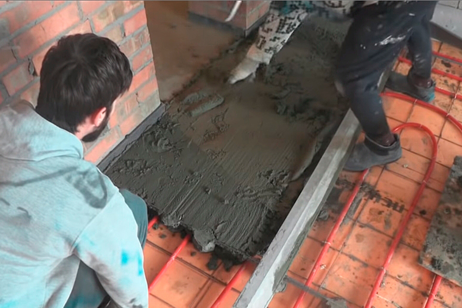 Заливку производят, используя готовые смеси. Их много в строительных магазинах, но выбирать надо из наиболее простых — есть составы, включающие теплоизолирующие элементы (пенопластовая крошка и т. п.). При заливке надо подать в трубку воду под рабочим давлением, чтобы исключить опасность распирания стяжки в процессе эксплуатации.