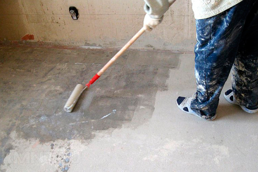 Когда стяжка застынет, ее покрывают слоем грунтовки. Это делается для защиты материала от внешней влаги или конденсата. После этого на поверхность стяжки кладут подложку (тонкий слой вспененного полиэтилена) и приступают к укладке линолеума.