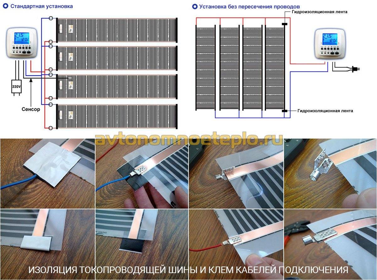 Размещение термоплёнки — медные контакты должны быть направлены вниз, соединение полос осуществляется зажимами. Укладывать плёнку нужно аккуратно, чтоб не повредить. Разрезать следует строго по специальным линиям.