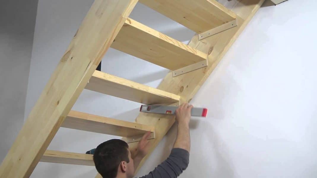 При монтаже лестницы у стены, в первую очередь к ней прикручивается одна тетива. После этого в ее пазы вставляются ступени. С обратной стороны ступени входят в пазы второго обрамления.