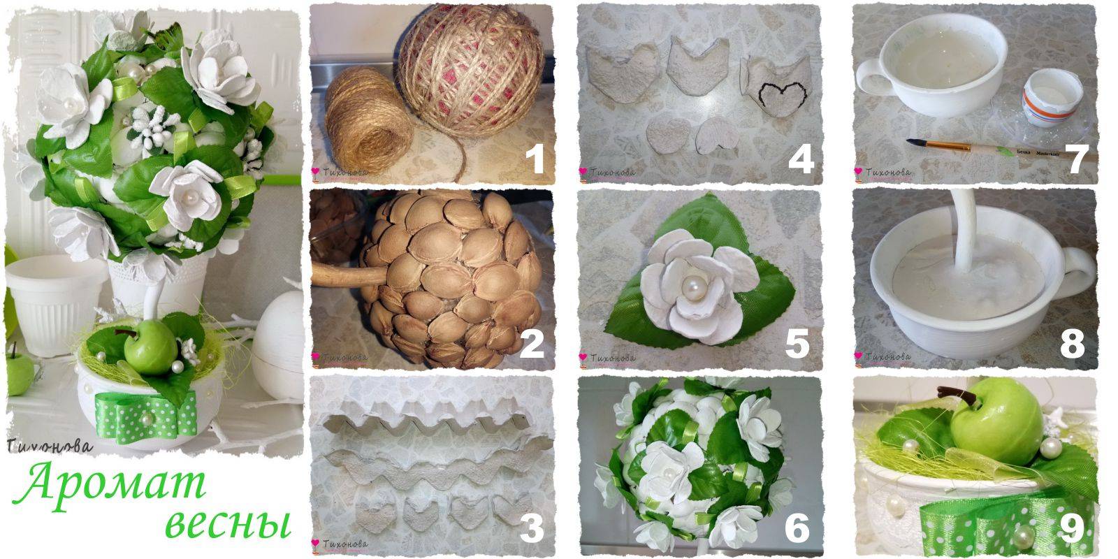 Пошагово полный мастер-класс — декоративное дерево «Очарование» с фото и видео: https://topiarii-mk.ru/topiarii-iz-tsvetov/.