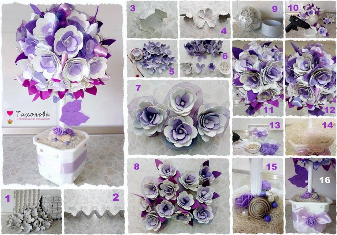 Подробный мастер-класс пошагово — дерево из цветов «Небесная гармония» с фото и видео: https://topiarii-mk.ru/topiary-iz-salfetok/.