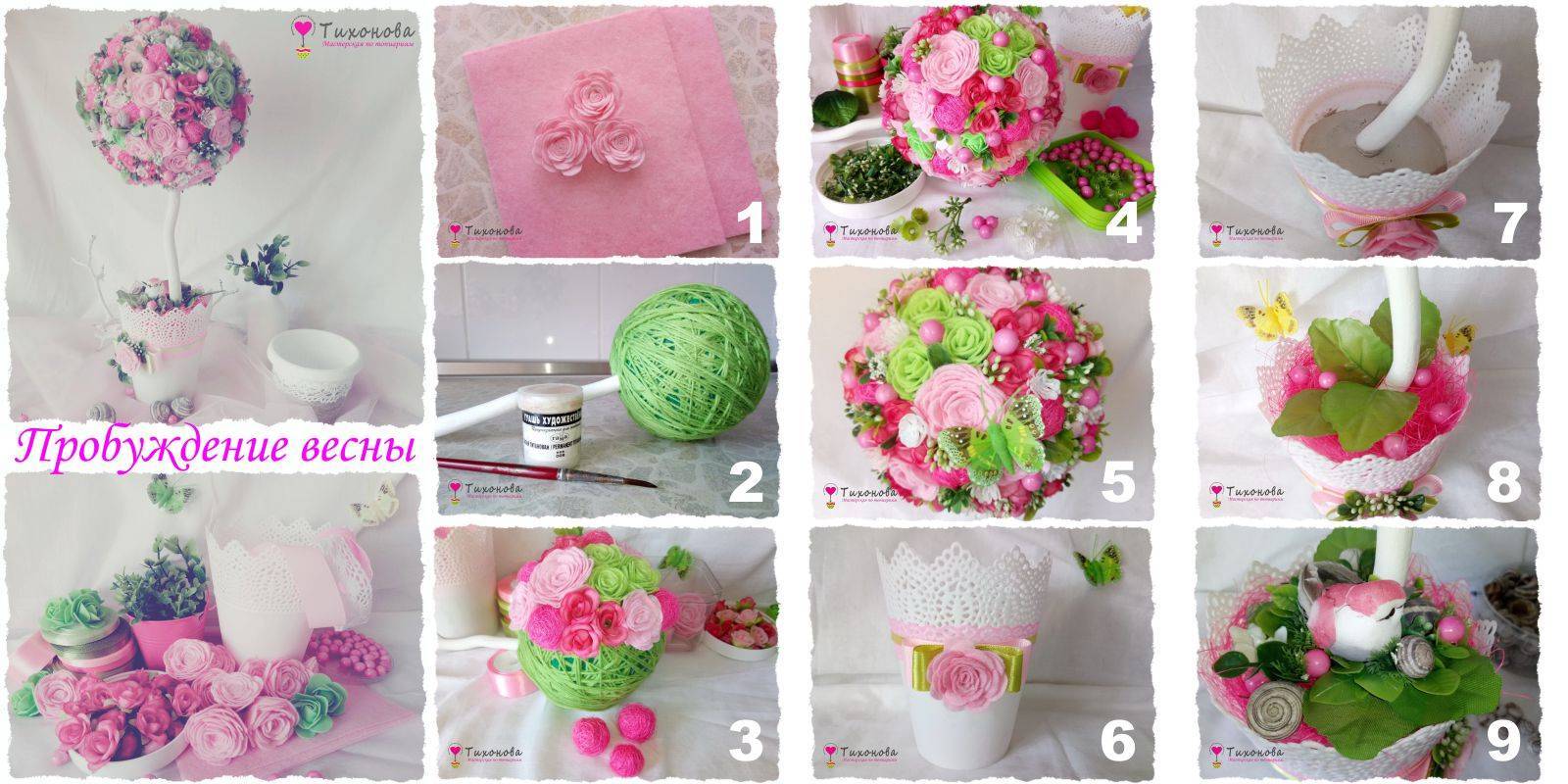 Подробный мастер-класс — пошагово цветочный топиарий «Аромат весны» с фото и видео: https://topiarii-mk.ru/tcvetochnoe-derevo-vesna/.