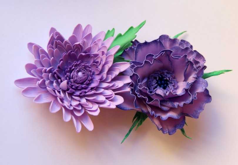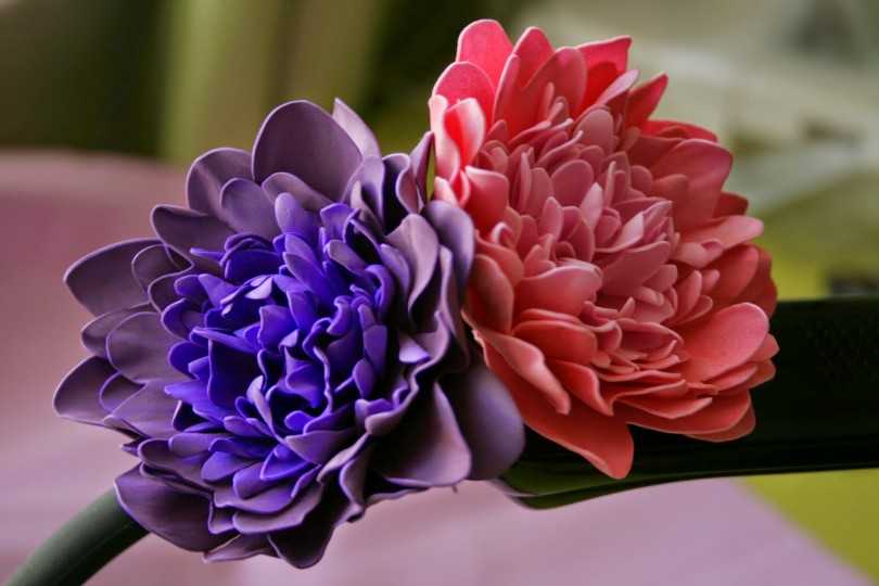 Фоамирановые цветы делают различных размеров: от небольших для брошей, ободков, до гигантских. Их используют для оформления интерьеров, фотозон. Они декоративны, практичны.