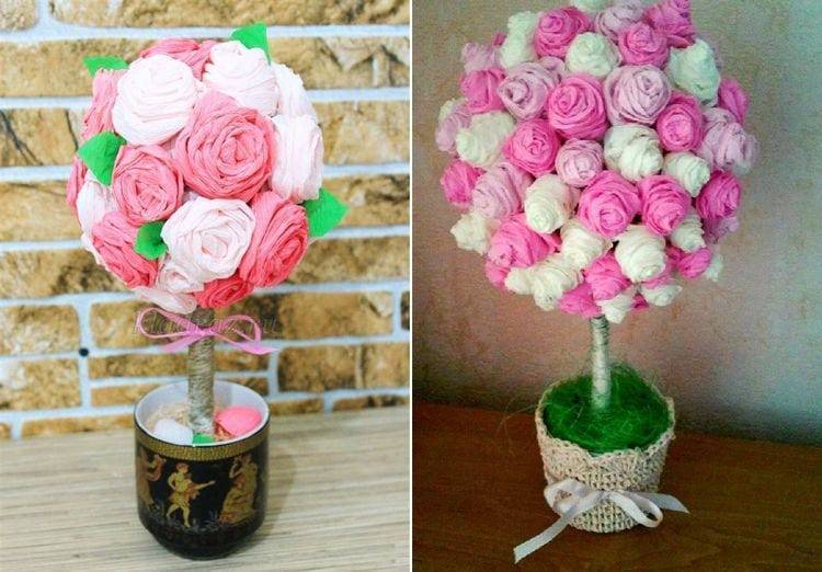 В следующей подборке фото представлены другие идеи дизайна топиариев, которые можно сделать своими руками по этому мастер-классу не только из гофрированной бумаги, но и из атласных лент, бумаги тишью и пр.