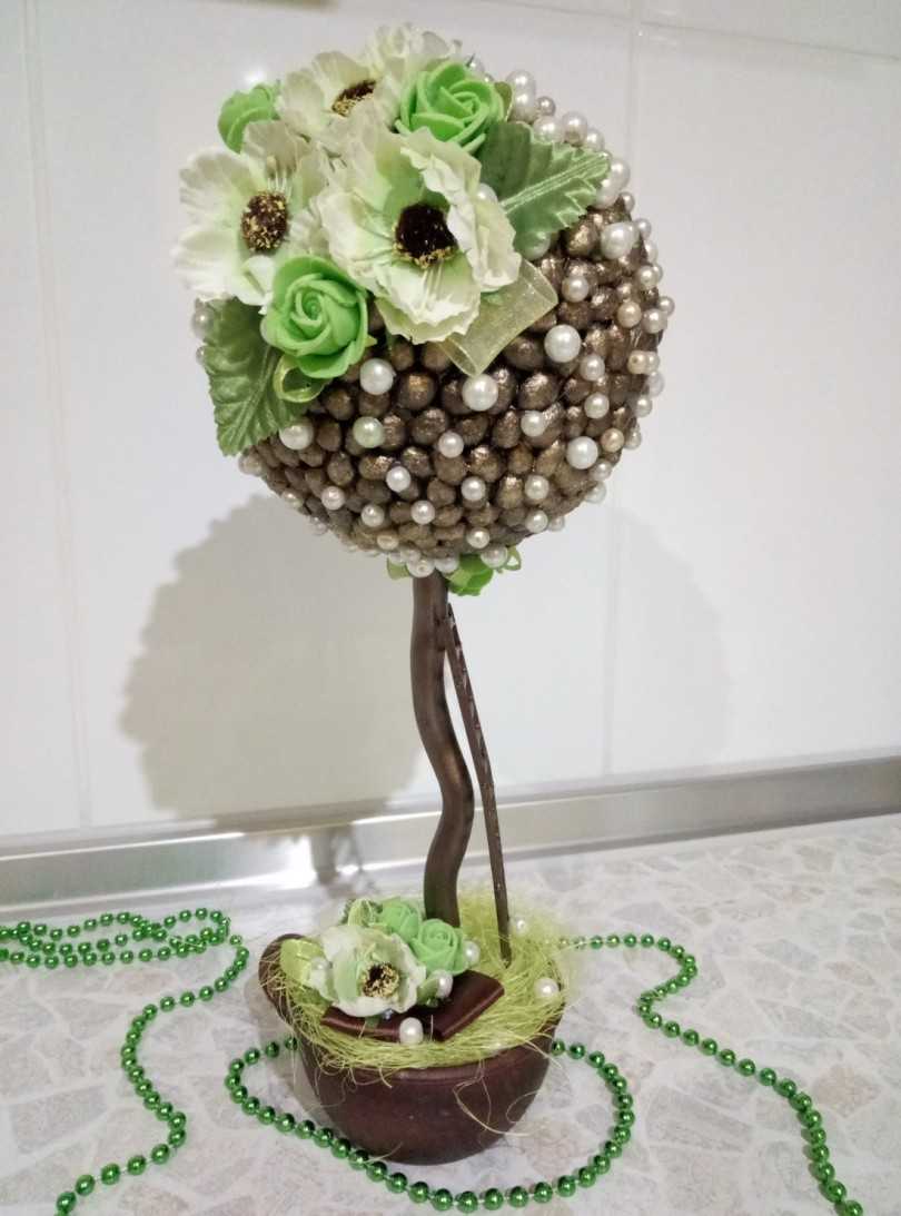 Полный мастер-класс — топиарий своими руками «Капельки росы» с фото и видео: https://topiarii-mk.ru/kofeynyiy-topiarii/.